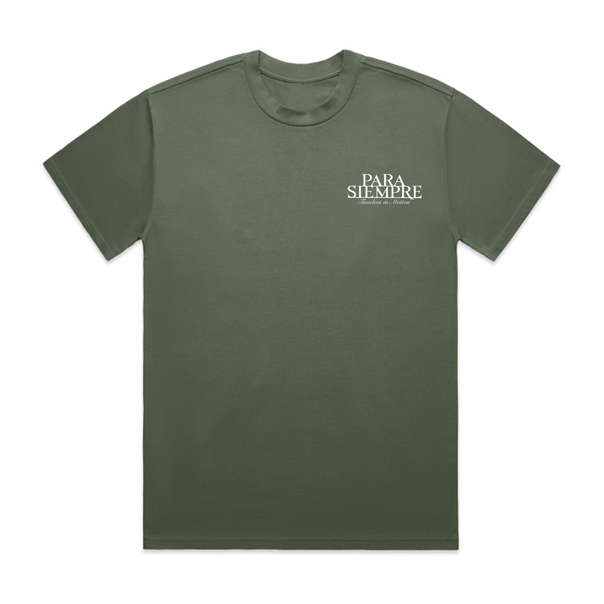 Design Details: Printed Para Siempre Timeless in Motion Front, Printed Para Siempre timeless in motion on Back.